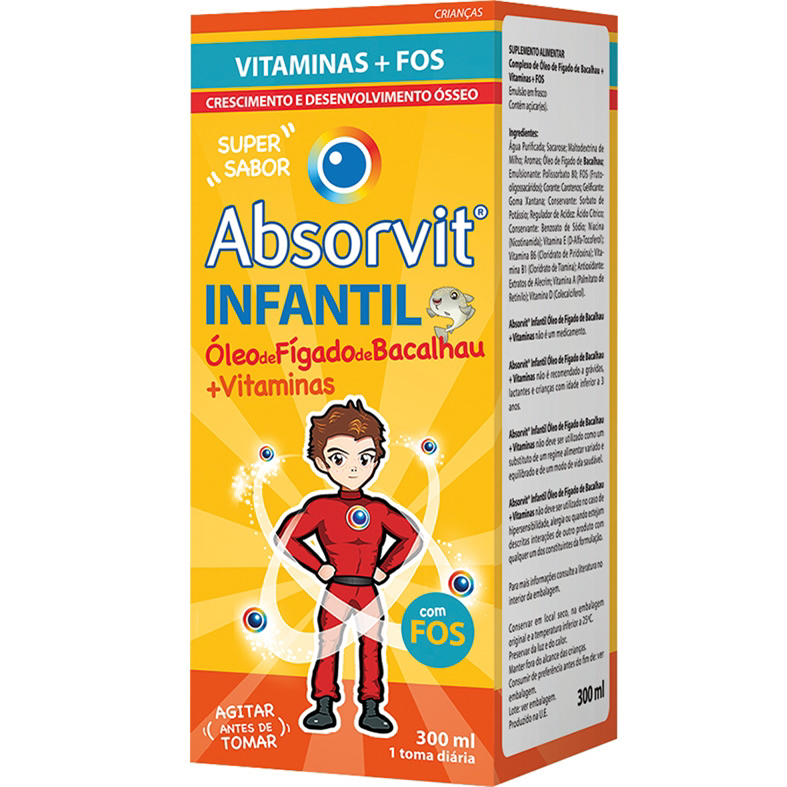 Absorvit® Infantil Óleo de Fígado de Bacalhau + Vitaminas é um suplemento alimentar com vitaminas e frutooligossacáridos (FOS), reforçado com Óleo de Fígado de Bacalhau, que foi especialmente desenvolvido para crianças a partir dos 3 anos de idade.