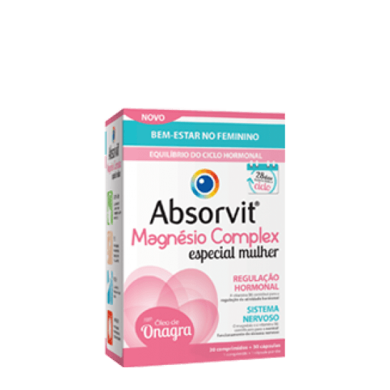 Absorvit® Magnésio Mulher é um suplemento alimentar com um complexo de óleo de Onagra, magnésio e vitaminas, especialmente concebido para assegurar o bem estar da mulher.