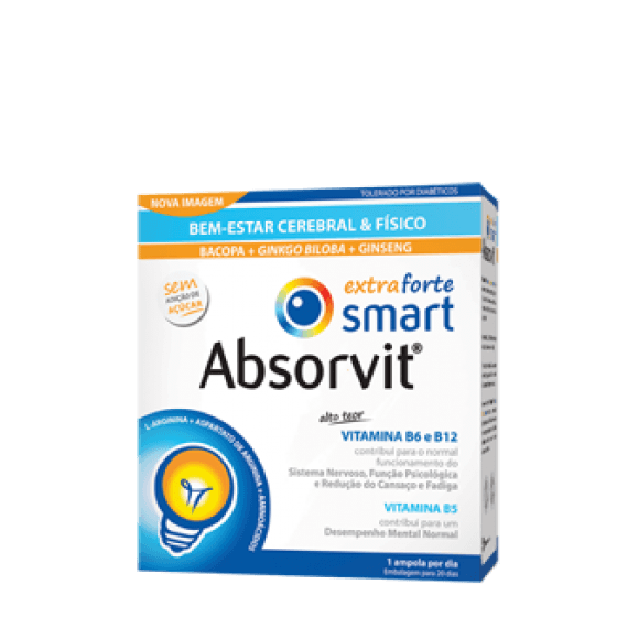 Absorvit® Smart Extra Forte é um suplemento alimentar composto por um complexo de plantas, aminoácidos, minerais e alto teor de vitaminas do complexo B. A vitamina B5 contribui para um desempenho mental normal.