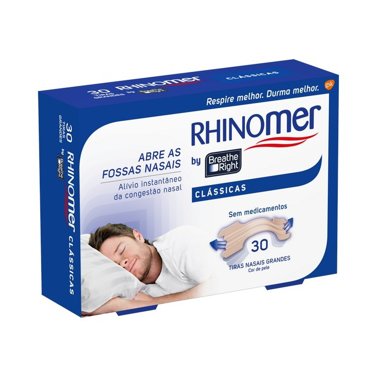 Tiras Nasais Rhinomer by Right. Abre as fossas nasais. Permite um alívio instantâneo da congestão nasal. Sem medicamentos. Ao abrirem as fossas nasais, as tiras nasais Rhinomer by Breathe Right melhoram o fluxo de ar, permitindo um alívio instantâneo da congestão nasal. As tiras nasais Rhinomer by Breathe Right não contêm medicamentos e está clinicamente comprovado que ao abrirem as fossas nasais permitem respirar 31% mais de ar. As tiras Rhinomer by Breathe Right são duas bandas plásticas flexíveis patenteadas. O adesivo especial permite que a tira se ajuste comodamente sobre as abas do nariz e a sua ação de flexão permite que as bandas elevem as fossas nasais abrindo e mantendo os canais nasais abertos. As tiras Rhinomer by Breathe Right podem ser usadas de dia ou à noite para o alívio de congestão nasal, devido a alergias, constipações, ressonar, ou desvio do septo, mas não devem ser usadas mais de 12h por dia.