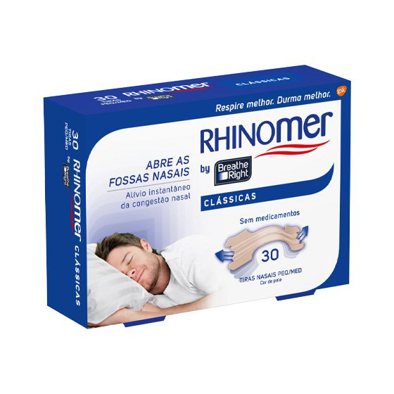 Tiras Nasais Rhinomer by Breathe Right. Abre as fossas nasais. Permite um alívio instantâneo da congestão nasal. Sem medicamentos. Ao abrirem as fossas nasais, as tiras nasais Rhinomer by Breathe Right melhoram o fluxo de ar, permitindo um alívio instantâneo da congestão nasal. As tiras nasais Rhinomer by Breathe Right não contêm medicamentos e está clinicamente comprovado que ao abrirem as fossas nasais permitem respirar 31% mais de ar. As tiras Rhinomer by Breathe Right são duas bandas plásticas flexíveis patenteadas. O adesivo especial permite que a tira se ajuste comodamente sobre as abas do nariz e a sua ação de flexão permite que as bandas elevem as fossas nasais abrindo e mantendo os canais nasais abertos. As tiras Rhinomer by Breathe Right podem ser usadas de dia ou à noite para o alívio de congestão nasal, devido a alergias, constipações, ressonar, ou desvio do septo, mas não devem ser usadas mais de 12h por dia.