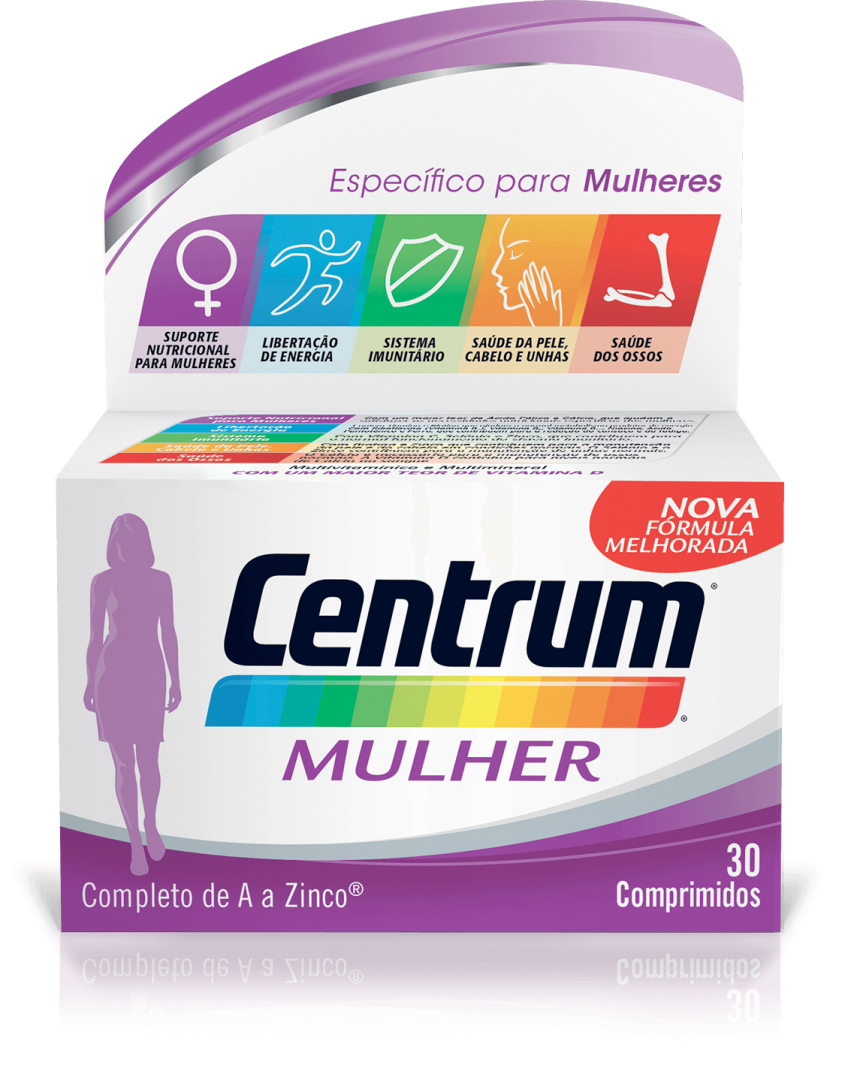 Em particular, o Cálcio, Ferro e Ácido Fólico têm um papel importante na manutenção adequada das funções do organismo das mulheres, e estão presentes em Centrum Mulher: