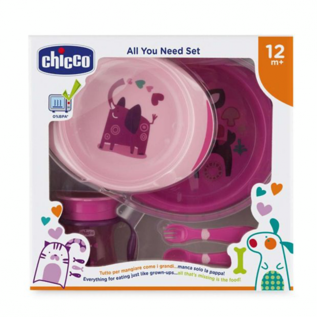 Contém: - Copo de refeição para beber como copo de adulto - Primeiros talheres para incentivar o bebé a comer sozinho - Conjunto de pratos para o máximo de conforto para a refeição