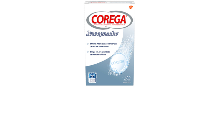 Corega Pastilhas de Limpeza Branqueadoras. Remove manchas e previne a sua formação. Elimina 99,99% das bactérias causadoras do mau hálito*. *em testes laboratoriaisCorega Pastilhas de Limpeza Branqueadoras limpa em profundidade as manchas difíceis (tabaco, café, etc). Elimina 99,9% das bactérias causadoras do mau hálito*. Para próteses dentárias e aparelhos ortodônticos. *em testes laboratoriais