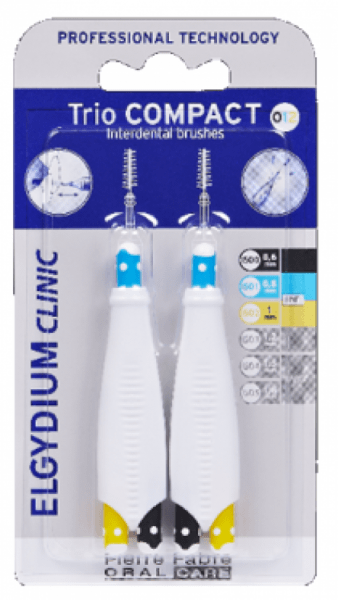 ELGYDIUM CLINIC ESCOVILHÃO TRIO COMPACT é o único sistema compacto e prático que combina três escovilhões num único cabo. Disponível em seis tamanhos diferentes. Cada tamanho tem uma cor correspondente, com diâmetro de arame específico (entre 0,38 e 0,80 mm) e diâmetro de cerdas específico (entre 1,9 e 8 mm) para se adaptar a todos os tamanhos dos espaços interdentários. Cinco versões disponíveis com uma escolha de escovilhões de um único tamanho ou mistos, com vários tamanhos.Têm ainda cerdas bicolores: brancas para revelar as gengivas sensíveis em caso de sangramento, e pretas, mais finas, para facilitar a inserção da escova e visualizar a eliminação da placa bacteriana.