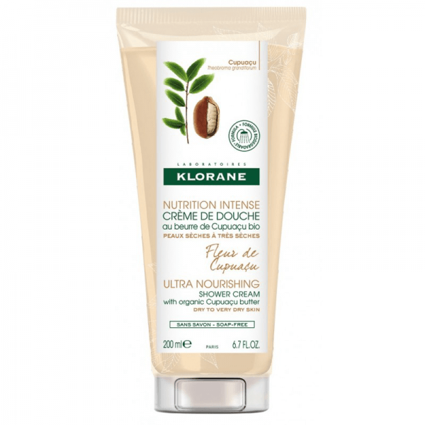 Klorane Creme Duche Flor de Cupuaçu de base lavante suave, sem sabão, que repara a barreira lipídica da pele seca a muito seca durante o duche.