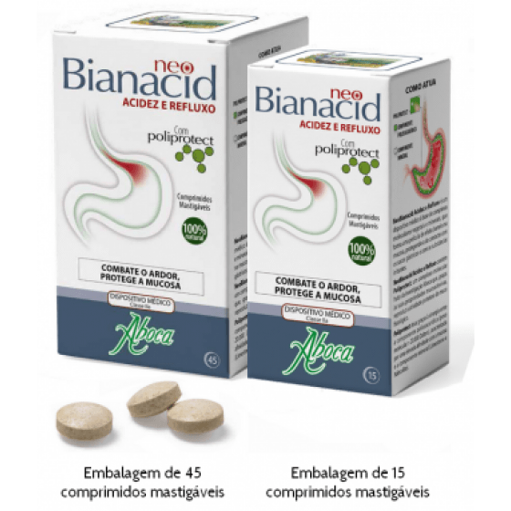 NeoBianacid Acidez e Refluxo forma uma película com efeito barreira na mucosa que a protege do contacto com os sucos gástricos e das substâncias irritantes.