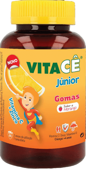 Vitacê ® Junior Gomas destina-se a crianças a partir dos 4 anos.Especialmente formulado para crianças (dos 4-12 anos), apresenta um agradável sabor a Tutti-frutti e uma fórmula avançada que combina o efeito da Vitamina C e do Zinco com os benefícios da Geleia Real e Própolis.